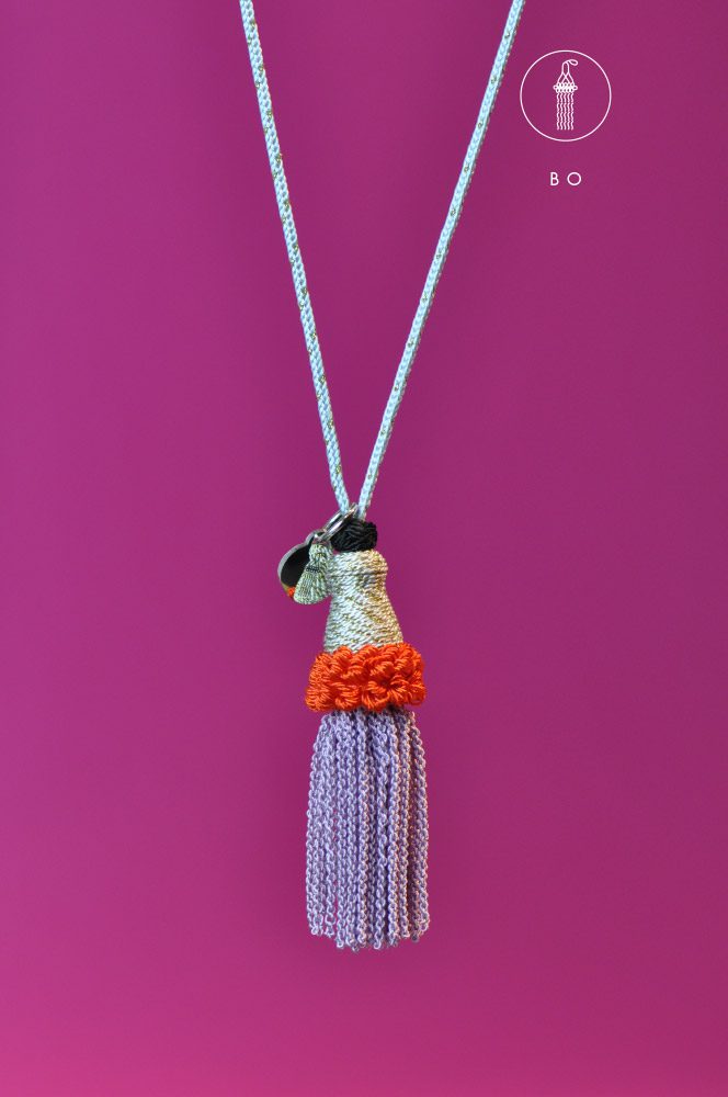 Die Flechtkette ist 12-fach geflochten und hat teils Silber-, Gold- oder Roségold-Brokatfäden eingeflochten. Sie hat keinen Verschluss. An der Kette hängt neben dem Tassel ein rundes Charm mit Logo-Gravuren, je nach Modell aus Edelstahl hochpoliert oder aus Edelstahl rosévergoldet.