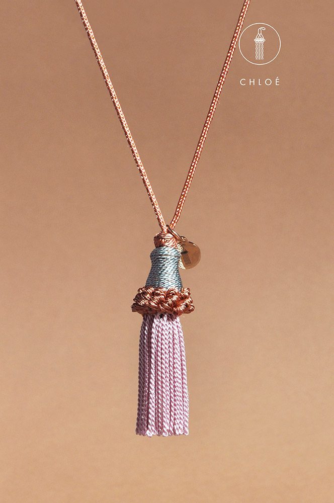 In der Flechtkette und in dem Mini-Tassel glitzern roségoldene Brokatfäden.