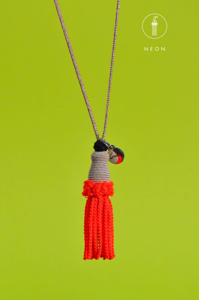 Neben dem Mini-TASSEL hängt an der Flechtkette ein rundes Charm mit Logo-Gravuren.