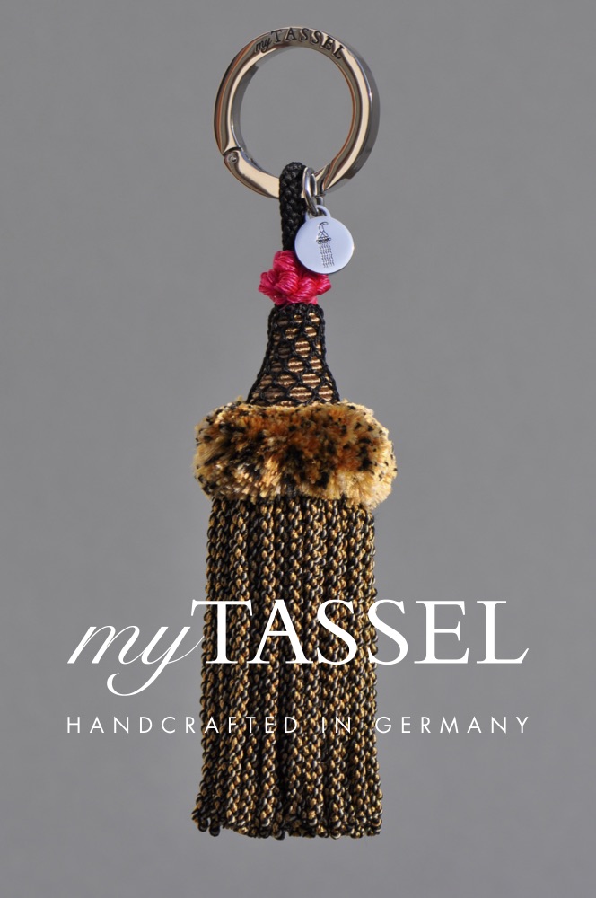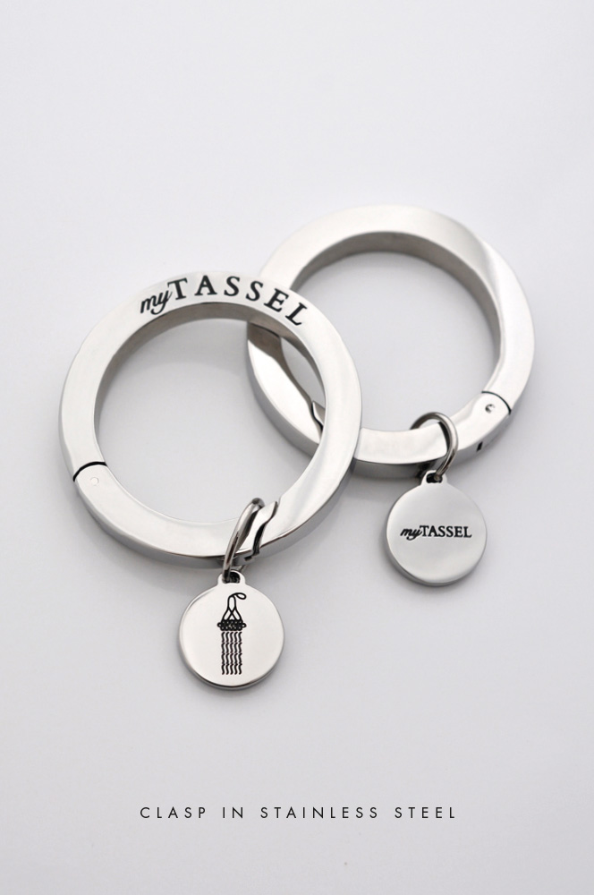 Die Schließe ist ein runder Karabiner mit einem Durchmesser von 4,5cm, in den „myTASSEL“ eingraviert ist.